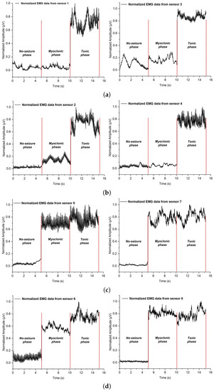 Figure 5 shows an example of the recorded row sEMG signal for no-seizure, myoclonic, and tonic phase motions. The difference in muscle contraction strength results in a difference in frequency and amplitude range for the three movements. Selected subjects were asked to avoid the direct effect of alcohol and caffeine on muscle contraction by the increase in calcium permeability. They were prohibited from consuming any source of caffeine and alcohol for at least 6 h before the test [37]. They were also asked to fast and stop drinking water for at least 2 h from the beginning of the test and until the end to eliminate the significant change in the bio-impedance quantity caused by food or fluid ingestion [37]. In the same direction, the measurements were performed for each volunteer under the same conditions, e.g., position and measurement duration. After 10 s of maximal contraction in all muscles for the tonic phase, the subjects simulated the myoclonic movement for 2 s with successive epochs of maximal contraction and relaxation in the upper limb muscles. Each subject was asked to simulate ten episodes, with two minutes of rest between trials to avoid muscle charging and ten minutes between motion measurements to avoid muscle fatigue. The four episodes closest to resembling a tonic, myoclonic, or no-seizure motion were chosen for further analysis.