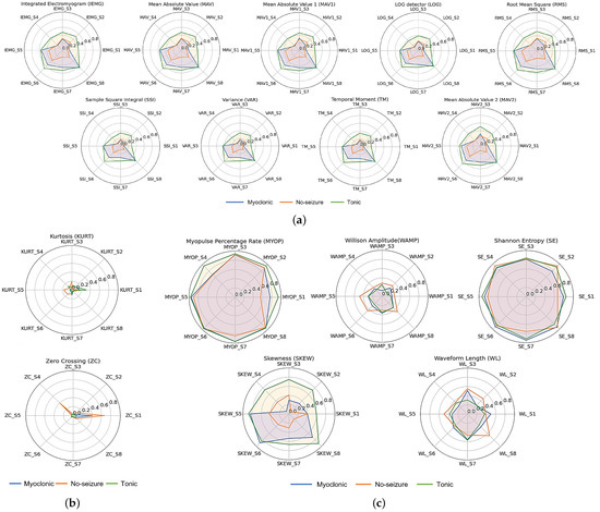 The first plot in Figure 6a presents the Integrated EMG feature and the impact of this feature to classify epileptic movements. Each axis presents a sensor (IEMG1, IEMG2, ⋯, IEMG8). From this figure, we can identify which sensor can better contribute to the classification of the movements. For example, for the IEMG plot IEMG_S5 and IEMG_S8 have almost the same value for myoclonic and tonic seizure and therefore, they cannot contribute to differentiate between tonic and myoclonic seizure movements. On the other hand, IEMG_S6 show big differences between myoclonic seizure, tonic seizure, and no-seizure and can contribute well for seizure classification. By interpreting the different extracted features, Figure 6a shows that the radar plots of the IEMG, MAV, MAV1, MAV2, RMS, VAR, TM, LOG, and SSI present redundant information that could be a time-consuming process when training a machine learning or deep learning model because the input to the model depends on the number of extracted features. Also, this mutual information can increase the complexity of a developed classifier. Figure 6b presents the radar plots of the normalized irrelevant features: Kurtosis (KURT) and Zero Crossing (ZC) features. The radar chart of the KURT and the ZC highlights irrelevant information, which means that these features can not distinguish between myoclonic, tonic, and no-seizure movements. As a result, the Kurtosis and Zero Crossing features should be removed. Figure 6c presents the radar plots of the normalized relevant features: WAMP, MYOP, SE, SKEW, and WL. These features can distinguish tonic, myoclonic, and no-seizure activities based on the difference in action potential between the three epileptic movements.