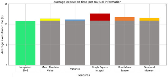 Different levels of complexity are presented starting from the horrible state (functions can be presented as , , or ), which is the highest time complexity level until the excellent state (functions can be presented as or ) which represents the lowest time complexity level. Based on Figure 7b, LOG, MAV1, and MAV2 present high-level time complexity (bad state for LOG: , Horrible state for MAV1 and MAV2: ) compared to other features including the IEMG, MAV, VAR, SSI, RMS, and TM, which presents the same time complexity level . Based on the Big-O feature selection technique, LOG, MAV1, and MAV2 features should be removed. For the six features with the same time complexity level, an average execution time for each feature is used to keep only one feature with a low running time. After ten time trials, Figure 8 shows that the Integrated EMG feature presents the lowest running time compared to other features, with an average execution time of 10.88 s. As a result, the IEMG feature will be used for further processing.