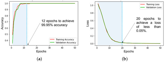 In this study, the dataset was divided into three parts for training, testing, and validation purposes. The dataset is divided into 70% training data, 15% testing data, and 15% validation data. After training the developed models based on the optimal hyperparameters presented in Table 4, the Decision Tree model achieved an average classification accuracy of 91.67% with a precision of 91.90%, recall of 91.67%, and an f1-score of 91.72%. The achieved results by the DT model are approximately the same as for the Random Forest model. The K-Nearest Neighbor model reached an average accuracy of 93.75% with a precision of 94.36%, recall of 93.75%, and an f1-score of 93.66%. However, among the four models assessed, the Artificial Neural Network model performed best. The ANN had an average classification accuracy of 99.95% with a precision of 99.43%, recall of 99.56%, and f1-score of 99.63%. Moreover, Figure 9 shows the training and the validation progress according to the number of epochs in terms of accuracy and loss. The training and validation accuracy reached about 99.95% for the first 10 epochs (Figure 9a). For the loss curve, the training and validation loss went down to about 0.05% with the first 20 epochs (Figure 9b).
