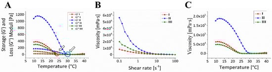 Rheological characterization of various (Alginate/Gelatin/GelMA) bioink compositions: I (1/4/5), II (1/8/2.5), III (1/2/10) in values of % w/v. (A) Storage (G′) and Loss (G″) moduli vs. temperature. Gelation points are circled and indicated with arrows, (B) Viscosity vs. shear rate at 10 °C, and (C) Viscosity vs. temperature.