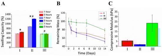 (A) Swelling capacity after 1 and 5 h in PBS. The symbols (* and #) indicate a statistically significant difference, based on p < 0.05 test, (B) Temporal degradation rates, and (C) Compressive moduli of the scaffolds produced from the respective ink compositions (I, II, and III) at 20% strain.