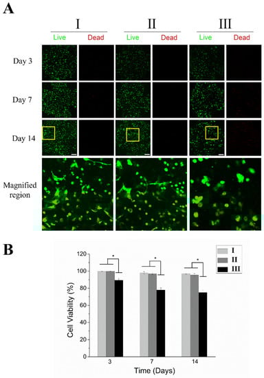 Cell viability was evaluated on days 3, 7, and 14 by live/dead staining. The Calcein-AM (green fluorescence) stains for live cells and ethidium homodimer (red fluorescence) for dead cells. Briefly, after the culture media was aspirated on days 3, 7, and 14, scaffolds were incubated in staining media, which consisted of 2 μM calcein-AM and 4 μM ethidium homodimer at 37 °C and 5% CO2 for 40 min in the dark. The scaffolds were rinsed three times with PBS and then placed in imaging chambers (ibidi, μ-Slide) containing culture media. The imaging was conducted using a confocal laser scanning microscope LSM 780 (by ZEISS, Oberkochen, Germany) equipped with an ×20 objective lens. The calcein (live) fluorophore was excited at 404 nm, and its emission was detected at 517 nm, while the ethidium homodimer (dead) was excited at 517 nm and its emission was detected at 617 nm. Multiple representative images were captured from the scaffold at a magnification of ×20. The number of live and dead cells was determined by using ImageJ software (Fiji,v. 2.13.1), and the cell viability was calculated according to Equation (6), defined as the ratio between the number of live cells and the sum of live and dead cells: