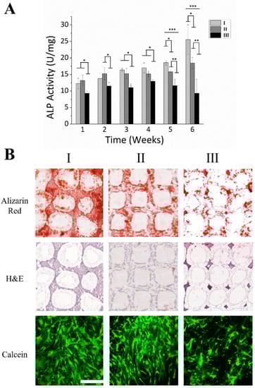 The differentiation of rMSCs into osteogenic cells was examined by analyzing alkaline phosphatase activity (ALP), indicating the presence of osteoblasts and, thus, new bone formation. Figure 5A displays the ALP activity of rMSCs in 3D bioprinted scaffolds over 6 weeks. Whereas ALP activity in Scaffolds I and II was significantly higher than in Scaffold III and continuously increased throughout 6 weeks; in Scaffold III, ALP activity demonstrated a decrease after week 4. After 6 weeks, Scaffold III showed only 8.5 ± 4.7 U/mg ALP activity, compared to 25.0 ± 4.6 and 17.5 ± 1.3 U/mg for Scaffolds I and II, respectively.