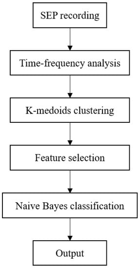 The SEP signals collected during the operation may contain power line interference, as well as artifacts of eye movement, EMG, and ECG []. These artifacts are outliers in the TFCs. We designed the SCI location identification method with the consideration of suppressing the artifact interference. For the feature extraction method, the k-medoids algorithm can deal with outliers better than the k-means algorithm can []. For the classification method, naive Bayes uses probability as the classification basis and needs to use all features during each prediction, and hence, it is relatively insensitive to noise and missing values in the training and test data []. Figure 6 shows that the k-medoids + naive Bayes method achieved the highest accuracy.