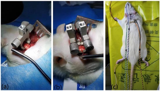 In a previous study, a distraction SCI was produced in rats using customized vertebral clamps []. For example, the distraction injury between cervical vertebra 5 and 6 (C5/C6) was denoted as C5, and the procedure was as follows: Animals were anesthetized for SCI and evoked potential testing and sacrificed using intraperitoneally injected pentobarbital sodium (60 mg/kg; Sigma, St. Louis, MO, USA) and xylazine (10 mg/kg; Sigma). The rats were placed on a thermostatic pad at 37 °C to receive a subcutaneous injection of 5 mL physiological saline solution to prevent dehydration. Using standard aseptic principles and techniques, dorsal ligament resection and facet arthrotomy were performed at the C4–C7 interspace. Customized vertebral clamps were used to rigidly hold the transverse processes of C4–C5 and C6–C7. The respective clamps of C6–C7 were distracted rostrally and caudally to produce a displacement of 3 mm and held for 1 s before being returned to their initial position. Figure 2 shows the recording of the surgical procedure.