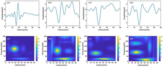 The waveform and MP-based TFD of an example SEP signal. (a1,a2) The normal group; (b1,b2) the cervical group; (c1,c2) the thoracic group; (d1,d2) the lumbar group.