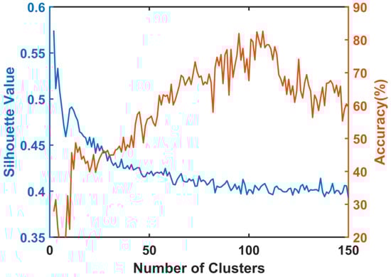 In this study, the purpose of TFC clustering was to divide the time-frequency space, and the divided time-frequency region was regarded as the feature. In order to extract the differences in the number of TFCs in different features, the number of clustering centers should be increased as much as possible. However, too many clusters will lead to overfitting. As the results show in Figure 4, when the number of cluster centers ranges from 2 to 150, the silhouette coefficient had a small change, ranging from 0.4 to 0.5. With an increase in the number of cluster centers, it gradually decreased and stabilized at 0.4. We set the number of clusters to 100, which corresponds to the minimum number of clusters as the silhouette stabilizes. We also recorded the curve of classification accuracy changing with the number of clusters. Clustering was randomly repeated 50 times for each set of clusters, selecting a different start point each time. The accuracy showed a trend of increasing and then decreasing as the number of clusters increases. The accuracy reached the maximum when the clustering number was close to 100.