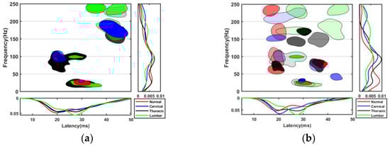 (a) TFD before feature selection and the probability density of TFCs in the direction of latency and frequency; (b) TFD after feature selection and the probability density of TFCs in the direction of latency and frequency. Red, blue, black, and green correspond to the normal, cervical, thoracic, and lumbar groups, respectively.
