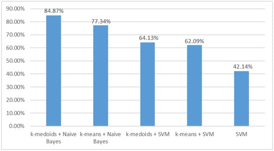 In order to know the accuracy of the method proposed in this paper, we compared the performance of the classifier with that of the support vector machine (SVM) used in a previous study. In the dataset of this study, the classification methods of k-medoids + naive Bayes, k-means + naive Bayes, k-medoids + SVM, k-means + SVM, and SVM were recorded with the highest accuracy. For a specific breakdown of the SVM, please refer to [].