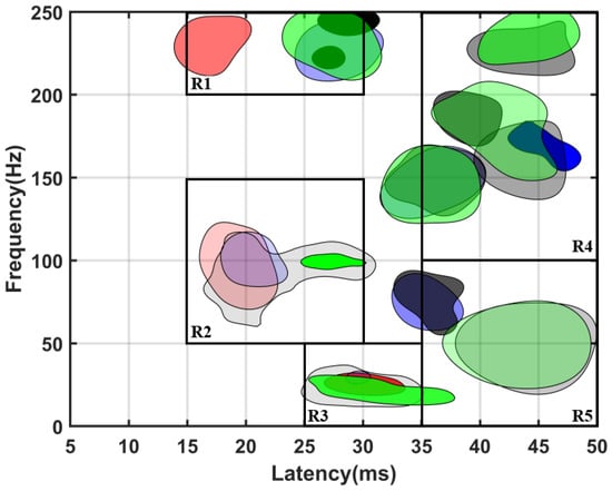 Nevertheless, there are some shortcomings to this feature extraction method. On the one hand, the intergroup correspondence of features was unstable. The main component can be used to detect the occurrence of SCI based on the reduction in the energy of the main component. When the energy of the original main component is greatly reduced or there is strong noise, other TFCs may become the highest-energy component. Therefore, the feature correspondence determined by this method is unstable. The correlation coefficients of latency and frequency help to explore this correspondence. However, it works only in a few regions []. Sub-TFCs, which have a wider distribution region, were also helpful to identify the location of the SCI [,]. In this paper, the TFCs were clustered, and the clustering model was applicable to all groups. Thus, the intergroup differences of TFCs could be directly compared.