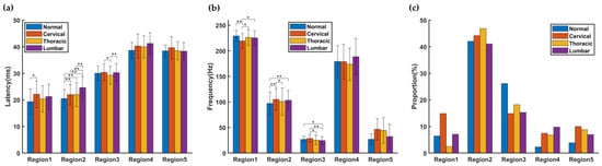 In R2, the latency of each injury group was significantly longer than that of the normal group. This region was the distribution region of the TFCs with the highest energy. The SCI caused prolonged latency of this peak, which is consistent with the results of previous studies [,]. The location changes of SCI also influenced the distribution of TFCs in frequency, but the SCI groups did not show consistent change. In the R4-5 region, the TFCs of the normal group were very few. However, all the SCI groups had TFC clusters in the same region. As shown in Figure 8c, the proportion of data of all SCI groups in R4 and R5 (6.8–10%) was higher than that in the normal group (2.3% and 3.8%). In contrast, in the R3 region, the proportion of data from the SCI groups (14.9–18.2%) was lower than that from the normal group (26.2%). In the region of R4 and R5, the proportion of TFCs in each SCI group was comparable.
