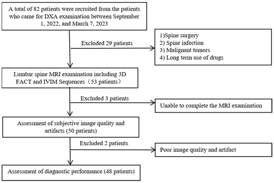 Between 1 September 2022, and 7 March 2023, 82 participants were enrolled prospectively and consecutively (Figure 1). MRI and DXA examinations of the lumbar spine for each participant were performed on the same day. A total of 29 patients were excluded for the following reasons: (1) spine surgery; (2) spine infection; (3) malignant tumors; (4) and long-term use of drugs that affect bone metabolism. Three of these patients were disqualified from the study because they were unable to cooperate in completing the MRI examination. Two patients were excluded for poor image quality and artifacts. Finally, a total of 48 participants were collected in the present study. The average age of the cases was 55.9 ± 15.2 years.