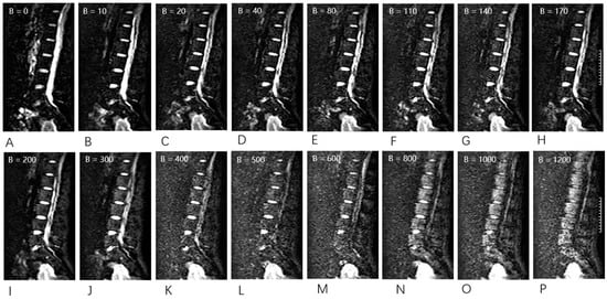 Raw intravoxel incoherent motion (IVIM) sequence data were acquired using 16 different b values (0, 10, 20, 40, 80, 110, 140, 170, 200, 300, 400, 500, 600, 800, 1000, and 1200 s/mm2) in sagittal orientation. (A–P) With an increase in the b value, the signal intensity decreased.