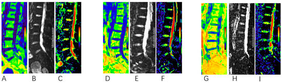 Representative PDFF, IVIM, and D images of 3 subjects ((A–C), normal bone density; (D–F), osteopenia; and (G–I), osteoporosis). (A–C) A 55-year-old woman with a low PDFF (green regions) and a high D in the lumbar region (red regions). The patient was classified into the normal group according to the DXA results. (D–F) A 57-year-old woman. The patient was classified into the osteopenia group. (G–I) A 67-year-old woman with a high PDFF (orange regions) and a low D in the lumbar region (green regions), the patient was classified into the osteoporosis group according to the DXA results.