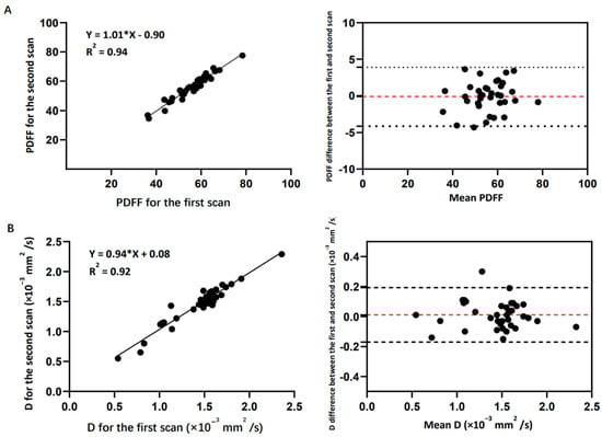 (A) Reproducibility results of the 3D FACT sequence: linear regression and Bland−Altman analysis plots of the 3D−FACT−sequence-measured PDFF between the first and the second scans. Mean bias is −0.11 (95% limit of agreement ranges from −4.11 to 3.89). PDFF has no unit. (B) Reproducibility results of the IVIM sequence: linear regression and Bland−Altman analysis plots of the IVIM−sequence−measured D value between the first and the second scans. Mean bias is −0.01 (95% limit of agreement ranges from −0.17 to 0.19 × 10−3 mm2/s).