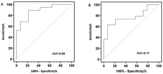 Receiver operating characteristic (ROC) curves and corresponding area under the curve (AUC) values of PDFF (A) and D values (B) between normal and osteoporosis.