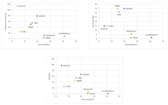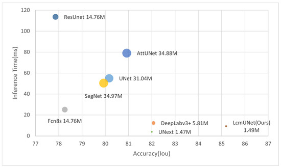 We compared LcmUNet with the current state-of-the-art methods on the ISIC2018 dataset, and it demonstrated excellent semantic segmentation accuracy and fast inference speed, as illustrated in Figure 1.