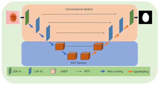 In the convolution stage, we use three LDA modules to downsample the input and maintain good feature-extraction ability while reducing model complexity. In the MLP stage, we utilize two layers of LMLP modules that fuse contextual information for deep feature extraction. These modules emphasize high-level semantic information, guiding the model to pay attention to local information and enhancing its feature representation ability.