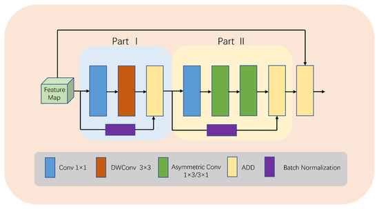 where X denotes features, PO denotes Part I, PT denotes Part II, DWConv denotes depth-wise convolution, Conv1 denotes conv 1 × 1, ASConv denotes asymmetric convolution, and BN denotes batch normalization.