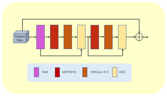 To solve this problem, this paper proposes a lightweight multilayer perceptron (LMLP) module, as illustrated in Figure 6. This module first performs a shift operation on the input image to convert features from a one-dimensional sequence to a token sequence. Then, it applies MLP operations on the token sequence in the width direction. Next, the module passes the features through a deep convolutional layer to reduce the number of parameters while enhancing the positional information and correlations between features. The tokens then undergo MLP operations on the height dimension, followed by another deep convolutional layer for further feature extraction. Since MLP operations are performed at the deep level of the model and the input features are relatively abstract and complex, performing MLP operations in both the height and width directions allows us to better focus on local information and effectively tackle the blurring problem at the junction of the background and segmented areas.