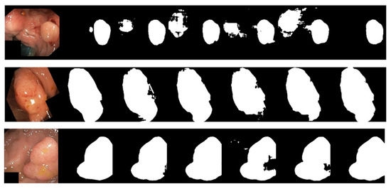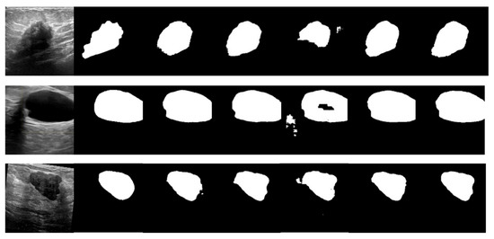 The BUSI dataset’s visualization in Figure 10 illustrates the differences between various segmentation methods used in breast cancer tissue slice images. These images have large variations in scale, perspective, and rotation, causing differences between different images of the same case. Moreover, breast cancer and normal tissues have similarities in their morphology, color, and other aspects, increasing the difficulty of segmentation and thereby resulting in some partial segmentation results, as seen in the first row of Figure 10. The LcmUNet network, however, can focus on details and texture information, effectively improving discrimination and accurately segmenting the boundaries of lesion areas, thereby achieving the best results among many algorithms.
