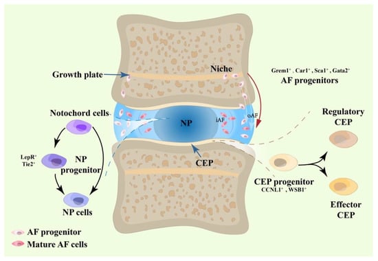 Low back pain (LBP) is an increasing social and economic burden on both global governments and individuals [1]. One of the major causes of LBP is the intervertebral disc degeneration (IVDD), which is characterized by the loss and dysfunction of IVD cells and the exhaustion of IVD progenitors [2,3]. The further development of IVDD leads to disc herniation, which exacerbates LBP. Current therapies against IVDD and disc herniation mainly include immobilization, analgesic drugs and surgeries [4]. While these therapies alleviate the symptoms, none reverse the IVD condition; however, developing stem/progenitor therapies could restore the IVD matrix and promote the growth of IVD cells. The IVD consists of three parts that are from distinct embryonic origins: the nucleus pulposus (NP), the annulus fibrosus (AF) and the cartilaginous endplate (CEP). The NP originates from the notochord [5], while the AF and CEP originate from the sclerotome [6]. After a series of cellular transformations with intrinsic regulation, the notochord turns into the NP, and the maturation of cells within the AF and CEP also results in the ablation of multipotency. However, a group of progenitors within the IVD retain their stemness and may play critical roles in future therapies.