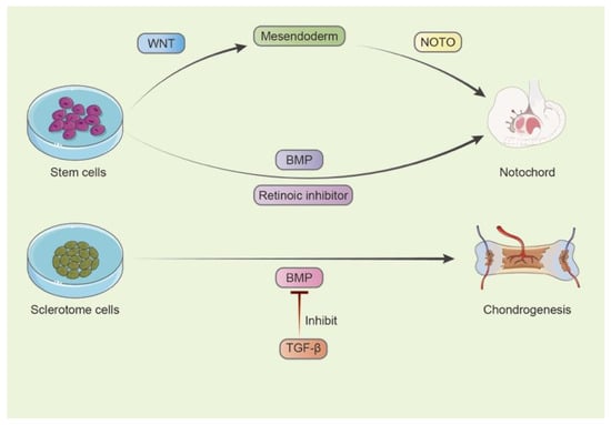 As summarises in Figure 2, notochord formation involves a series of intrinsic signals, including BMP, WNT and Activin/Nodal. By activating the WNT pathway via GSK3β, CHIR definitively induced differentiation towards mesendoderm progenitor cells (MSPCs), but it was not enough to maintain their notochordal fate, even with Activin/Nodal. The subsequent transfection of the notochordal typical gene NOTO in MSPCs created and maintained a stable notochordal cell population, which was in accordance with a previous study [34]. Sequencing results coincided with this, as the prolonged expression of mesendoderm genes persisted only in NOTO-transfected cells. Additional functional enrichment analysis highlighted notochord development, which further validated this finding [31]. This finding supports the vital impression of the WNT and BMP pathways in the formation of NC cells.