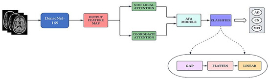 For the diagnosis of AD, neuroimaging technology is used as an important diagnostic tool. The various neuroimaging modalities are Computed Tomography (CT), structural Magnetic Resonance Imaging (sMRI), Positron Emission Tomography (PET), functional MRI (fMRI), and single-photon emission CT. sMRI and fMRI have become increasingly important in the diagnosis of structural and functional changes, respectively [5]. MRI is the gold-standard neuroimaging technique for assessing anatomical and functional changes from a pathological perspective. Due to its unique features, MRI has become the key imaging modality for diagnosing AD and detecting MCI in recent years. In the context of clinical screening for Alzheimer’s disease, the traditional methods using MRI have shown relatively satisfactory results for differentiating between AD and healthy controls (HC). MRI findings for MCI and AD appear quite similar, making it difficult to distinguish MCI from AD. Hence, this research work proposes an effective deep learning network based on DenseNet-169 architecture integrated with two attention modules, namely ENLA and Coordinate Attention. An AFA module is used to fuse the features in an effective way for precise classification.