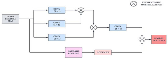 As illustrated in Figure 5, the feature maps from the adjacent layers are first concatenated and passed through the SE layer to capture strong correlations across the channels. These feature maps are then fed into a pointwise convolution to reduce the number of filters. Then, the global average pooling layer is applied to extract channel-wise attention features on a global scale. The feature map is then propagated to the softmax function, which suppresses the irrelevant background noise and retains only the important information. Furthermore, the reweighted low-level features are added to the high-level features for improved feature representation power and precise localization. This operation is formulated in Equation (10).