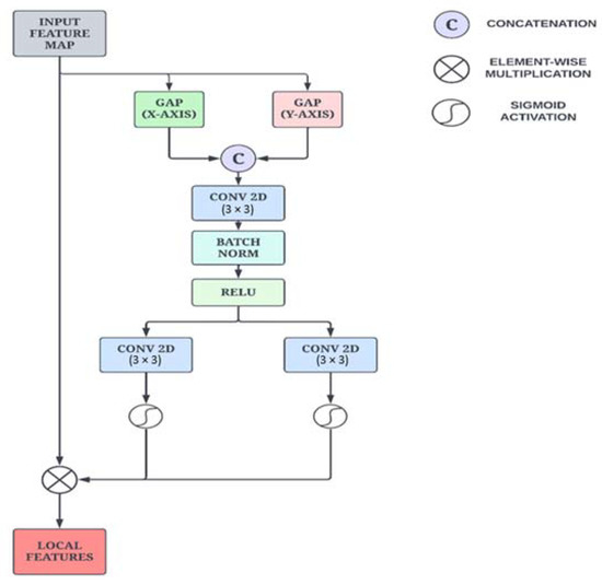 Next, a convolution operation is performed in each group to transform the tensors with the same number of channels. Finally, after the sigmoid operation is applied, the raw feature maps are reweighed in the x and y directions, yielding Equations (7) and (8).