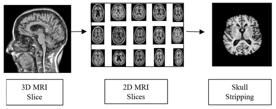 To obtain accurate classification results, preprocessing steps are necessary to prepare the input data. The raw data in Neuroimaging Informatics Technology Initiative format is used as an input for the pre-processing phase. The 3D MRI voxels are converted into 2D slices for further processing. The pre-processing operations carried out in this work are presented in Figure 6. Skull striping is performed to remove the non-brain structure and unwanted portions from the scanned image. The scalp, skull and dura from the sMRI were removed using morphological structuring. Furthermore, the dataset was split into training, validation and testing sets in the ratio 60:20:20.