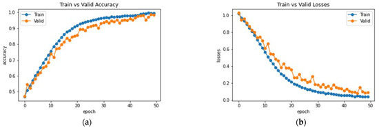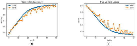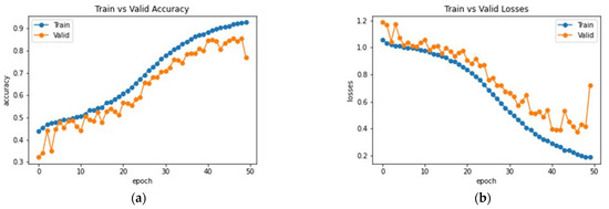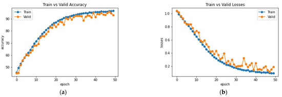 All image pre-processing tasks and training of the proposed model were implemented on the AWS EC2 instance using the Pytorch framework with a 16 GB NVIDIA T4 GPU. The proposed work utilized system resources consisting of the Ubuntu 20.04 operating system, 4 AMD vCPUs, and 32 GB of RAM. The model employs Stochastic Gradient Descent (SGD) with a learning rate of 1 × 10−3, momentum of 0.9, and weight decay of 1 × 10−3 for optimal performance and fast convergence. The proposed network was trained and validated for 50 epochs. To decrease the training time of the network without compromising on performance, we employed mixed-precision training using the AMP CUDA library. Moreover, to prevent the problem of vanishing gradients, gradient scaling was employed during backpropagation.