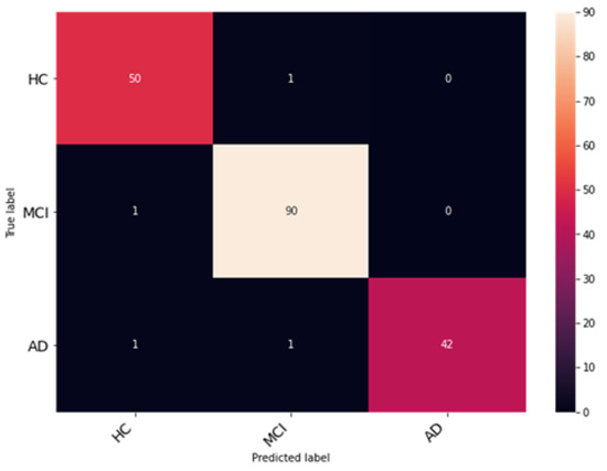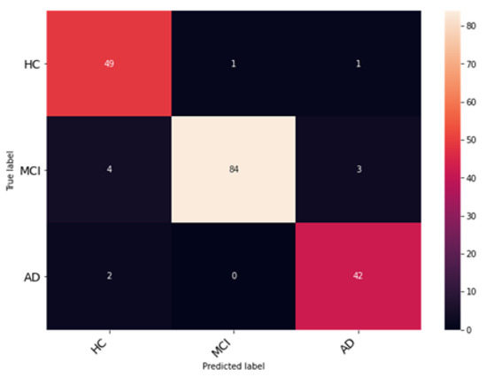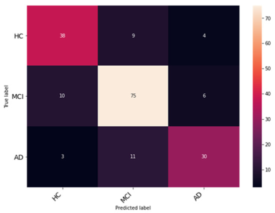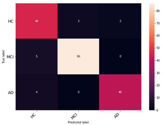 Evaluation of classification performance using confusion matrices for classes HC, MCI, and AD.