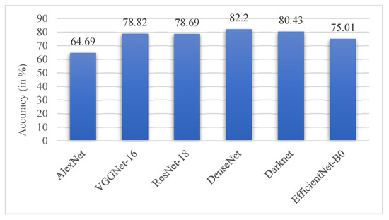 Of all the architectures compared, DenseNet performed the best with an accuracy of 82.2%, followed by DarkNet with an accuracy of 80.43%. It could be inferred that AlexNet performed poorly on the ADNI dataset with a low accuracy score of 64.69%, as illustrated in Figure 16. The performance of the proposed AHANet managed to improve on DenseNet by 16.33%. On the whole, it could be inferred from Table 8 that AHANet outperformed the existing state-of-the-art architectures by a large margin.