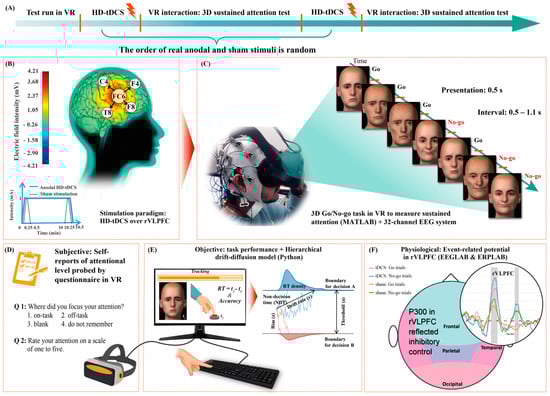 Schematic depiction of the experimental protocol. (A) Sequence of experimental phases; (B) real and sham high-definition transcranial direct current stimulation (HD-tDCS) interventions; (C) integration of the 32-channel electroencephalography (EEG) system and virtual reality (VR) setup to measure three-dimensional (3D) sustained attention after stimulation; (D) subjective reports of attentional level were obtained using a questionnaire displayed in VR after every 10 Go/No-go (GNG) task trials; (E) objective measurements of sustained attention were obtained by tracking performance in the GNG tasks in terms of reaction time (RT) and accuracy using a VR- and keyboard-connected computer, and further decomposing behavioral metrics into the hierarchical drift-diffusion model; and (F) sustained attention was physiologically analyzed based on the averaged ERPs of the FC6, F4, F8, C4, and T8 channels in the right ventrolateral prefrontal cortex (rVLPFC) using EEG data.
