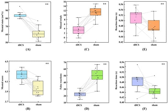 Subjective report results and behavioral performance after real high-definition transcranial direct current stimulation (HD-tDCS) and sham stimulation. (A) Percentage of “on the task” options selected in the total mental feedback; (B) averaged mental scores; (C) missed trials in Go trials; (D) false reactions in No-go trials; (E) averaged reaction time (RT) in the correct Go trials; and (F) averaged RT in the incorrect No-go trials. ** indicates a significant difference (p < 0.05) in the Wilcoxon signed-rank tests.