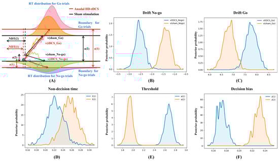 The hierarchical drift-diffusion model (HDDM) results after high-definition transcranial direct current stimulation (HD-tDCS) and sham stimulation. (A) Reaction time (RT) distributions and modeled streams of noisy observations, where the lengths of HDDM indicators are proportional to the averaged results of all participants after HD-tDCS and sham stimulation; (B) drift rates in No-go trials; (C) drift rates in Go trials; (D) non-decision time; (E) decision thresholds; and (F) initial decision bias.