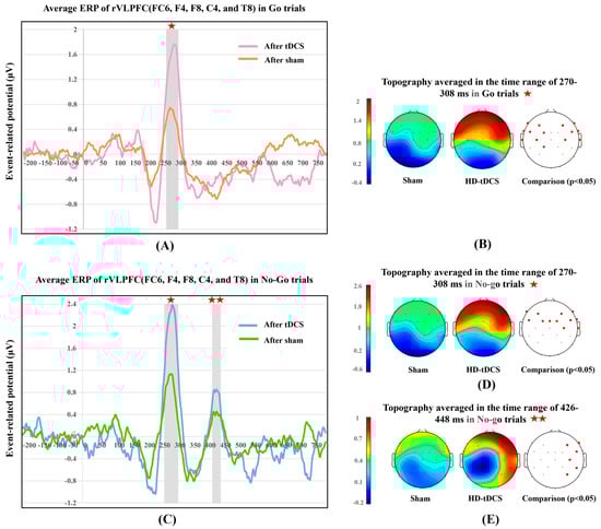 ERPs can be used to quantify stimulation-triggered regional neuronal excitability with good temporal resolution [,]. According to the existing literature on ERP, the stimulation-locked P300 component associated with the rVLPFC triggers the outright inhibition in response to stop signals [,,,]. Hence, the P300 here was used to evaluate the level of inhibition reaction and mirror the tDCS-evoked functional activation of the rVLPFC. As described in detail in Supplementary Figure S1, the collapsed localizers approach was used to unbiasedly define the time windows for the ERP components, and ERPs were robustly quantified by the mean amplitude in these windows [,]. P300 amplitudes were averaged in the 270–308 ms time range and across the FC6, F4, F8, C4, and T8 channels to compare them between the two stimulation conditions for the Go and No-go trials. Additionally, another positive deflection at P400 was observed in the No-go trials, and its amplitudes were averaged in the 426–448 ms time range and across rVLPFC channels. Finally, we also depicted the mean scalp topographies in the aforementioned time windows to represent the corresponding energy distributions and confirm that the ERP analyses in pooled rVLPFC electrodes were plausible.