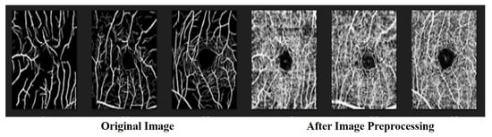 After pre-processing the ROSE dataset, the blood vessels were not evident in the image or were blurred into the background. Because the model could not capture vascular features, it could not perform an accurate classification, as shown in Figure 2. Because preprocessing the data did not improve accuracy, we did not use the preprocessed version of the ROSE dataset in the experimental comparison.