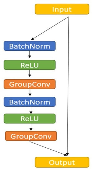 Increasing the depth of a network is key to optimizing performance; however, as the network deepens, vanishing and exploding gradients degrade the effectiveness of the training process. Therefore, we replaced the general convolution layer in U-NET with a ResBlock to enhance the feature extraction capabilities of the model. An identification mechanism is also included with the stack of residual blocks to avoid performance degradation with deeper layers. Additionally, batch normalization is performed in the residual block to mitigate the vanishing gradient problem and accelerate the convergence. We also used the rectified linear unit activation function in each network layer. The residual block used in the proposed model is shown in Figure 5.