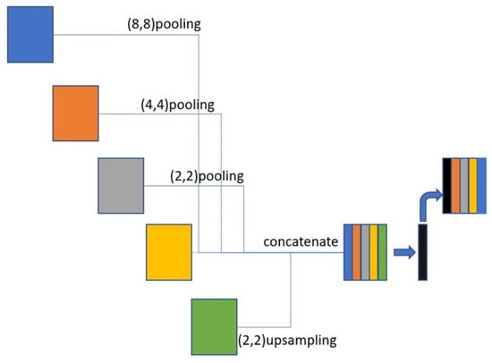 In the upsampling and downsampling processes of U-NET, small-scale feature maps are finer but smaller, whereas large-scale feature maps are larger and the features are relatively rough. Therefore, establishing different scales for sharing information is important. U-NET has a skip connection mechanism, but does not directly extract sufficient information from different feature scales. In contrast, our proposed method uses a full-scale skip connection to combine different scales of feature maps to enable the model to refer to features at different scales. For large-scale feature maps, downsampling is performed to unify the sizes of the feature maps, and eight-fold, four-fold, and two-fold downsampling is performed individually. For small-scale feature maps, two-fold upsampling is performed to unify the feature map size. Finally, various feature maps are combined and the features extracted using the residual block. This procedure is repeated as shown in Figure 6.