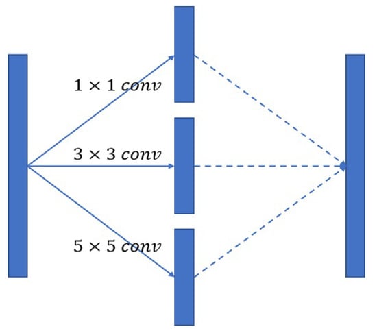One common method to increase the accuracy of neural networks is to simply increase their depth or width for a greater probability of determining optimum parameters. However, this method suffers from problems with overfitting owing to an excessive number of parameters. Therefore, methods to implement deeper or broader neural networks are important. GoogLeNet was the primary neural network model used in the ImageNet Large-Scale Visual Recognition Challenge (ILSVRC) in 2014 []. GoogLeNet supports wider and deeper neural networks by incorporating a stack of inception modules, which enables it to extract different features through multiple convolution kernels while changing the width of the neural network. Wider GoogLeNet models require significantly less training, and have correspondingly lower computational complexity. These advantages mitigate the overfitting problem that affected prior neural network architectures. In this study, our proposed network architectures incorporates an inception block to extract more diverse features.