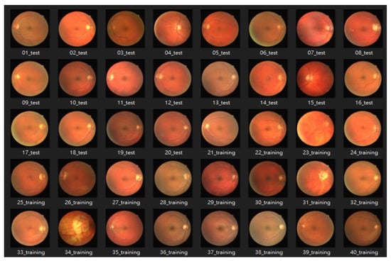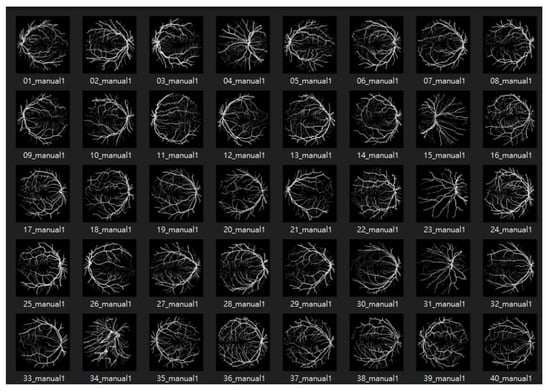 The DRIVE database [] was created to compare and study retinal vessel segmentation methods. Physicians can use DRIVE to observe the vascular morphology of the retina such as its length, width, sinuosity, and angle to diagnose cardiovascular and ocular diseases including diabetes and hypertension. The photographs provided in the DRIVE database were obtained from a diabetic retinopathy screening project in the Netherlands. The screened participants included 400 diabetes subjects aged 25–90 y. Forty photos were randomly selected, including 20 for the training set and 20 for the testing set, as shown in Figure 8 and Figure 9.