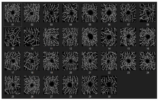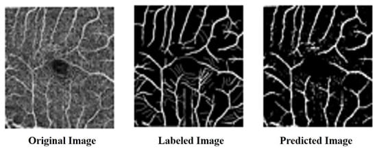 The ROSE dataset [] consists of 39 subjects, including 30 images for training and 9 images for testing. Each image is 304 × 304 pixels in size. Manual annotations of the blood vessels were performed by medical imaging experts and clinicians [] as shown in Figure 10 and Figure 11.