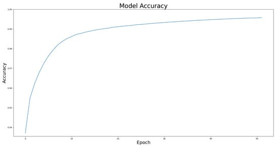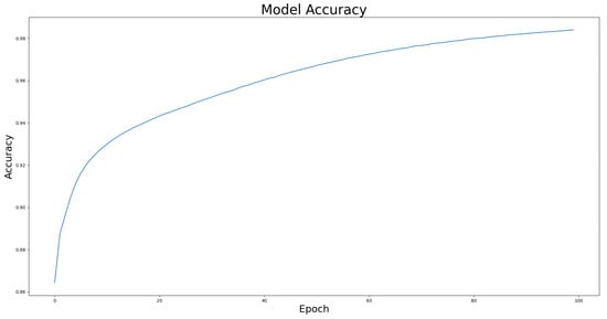 We compared the performance of the proposed architecture with that of U-Net, ResUNet, U-Net3+, and ResUNet++ models individually on the two benchmark datasets DRIVE and ROSE, and the experimental results are listed in Table 1 and Table 2. The data in Table 1 and Table 2 show the best results for various models in the experiments. The experimental results showed that the proposed improved U-NET model with residual blocks, full-scale skip connection, and an inception block performed well. The image segmentation results are presented in Figure 12 and Figure 13. The training curves of the accuracy and loss values are shown in Figure 14, Figure 15, Figure 16 and Figure 17. The training dataset consisted of 5000 samples with a step size of 100, and all the models were trained for 100 epochs. Our proposed method exhibited an accuracy 0.998, while the value of the loss function was 0.003.