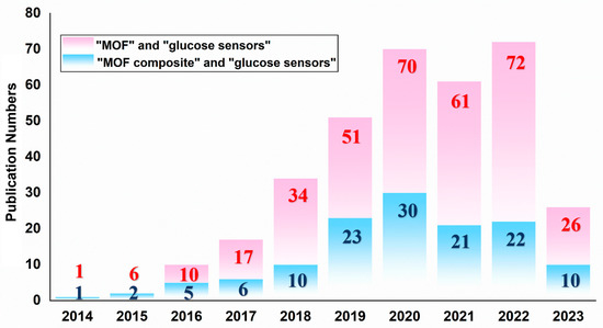 Number of MOF-based and MOF composite-based glucose sensor-related articles published in the past 10 years (up to 1 June 2023), obtained from Web of Science.