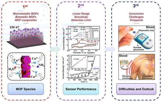 Despite these attractive properties of pristine MOFs, the low conductivity and poor stability hinder their applications [36,37]. MOFs can be facilely coupled with functional materials to prepare MOF composites with more efficient electrochemical reactivity rates and higher electrical conductivity [38,39,40]. In addition, MOF derivatives (e.g., metal oxides/carbon composites) have also attracted much attention for their rich internal voids and good electrical conductivity [41,42,43,44]. However, during the derivation of MOFs, the structure of MOFs can collapse unexpectedly, weakening their advantage of large surface area. Therefore, in recent years, more and more studies on MOF-based non-enzyme electrochemical glucose sensors have been focused on MOF composites (Scheme 1). However, there are no specific reviews of the applications of MOFs and their composites in non-enzymatic electrochemical glucose sensors. Herein, as shown in Scheme 2, the advanced research progress of pristine MOFs and their composites in non-enzymatic electrochemical glucose sensors as modified materials for electrodes is reviewed. Additionally, the existing difficulties and future development trends of advanced MOF-based non-enzymatic electrochemical glucose sensors are discussed.