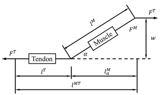 The muscles that affect the force on the pelvis during exercise are mainly the gluteal muscle group, the piriformis muscle group, and some of the trunk muscles. The gluteal muscle group is responsible for hip extension, leg movement, and pelvic stabilization. The piriformis muscle group is located beneath the gluteal muscles and contributes to the outward rotation of the hip joint. The trunk muscles that connect to the hip bone include the iliacus, psoas, and abdominal muscles. Currently, most muscle research is based on the Hill-type model [60]. This model simplifies muscles as active contraction and passive spring units and tendons as nonlinear spring units. There is an angle α between muscles and tendons, as shown in Figure 1.