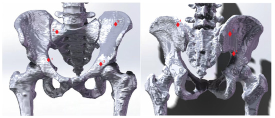 Seven strain measurement points. The seven red diamond markers indicate strain measurement points used to validate the finite element (FE) model. These markers reference cadaveric experiments conducted by Hao [42]. The numbers 1–7 correspond to the following landmarks: the midpoint of the iliopectineal line; the central point of the acetabular inner plate; a point on the 1st sacral vertebra near the sacroiliac joint; a point on the ilium of the sacroiliac joint as high as the 1st sacral vertebra; the iliac fossa; the highest point of the ischial notch; and a point on the posterior ilium near the sacroiliac joint.
